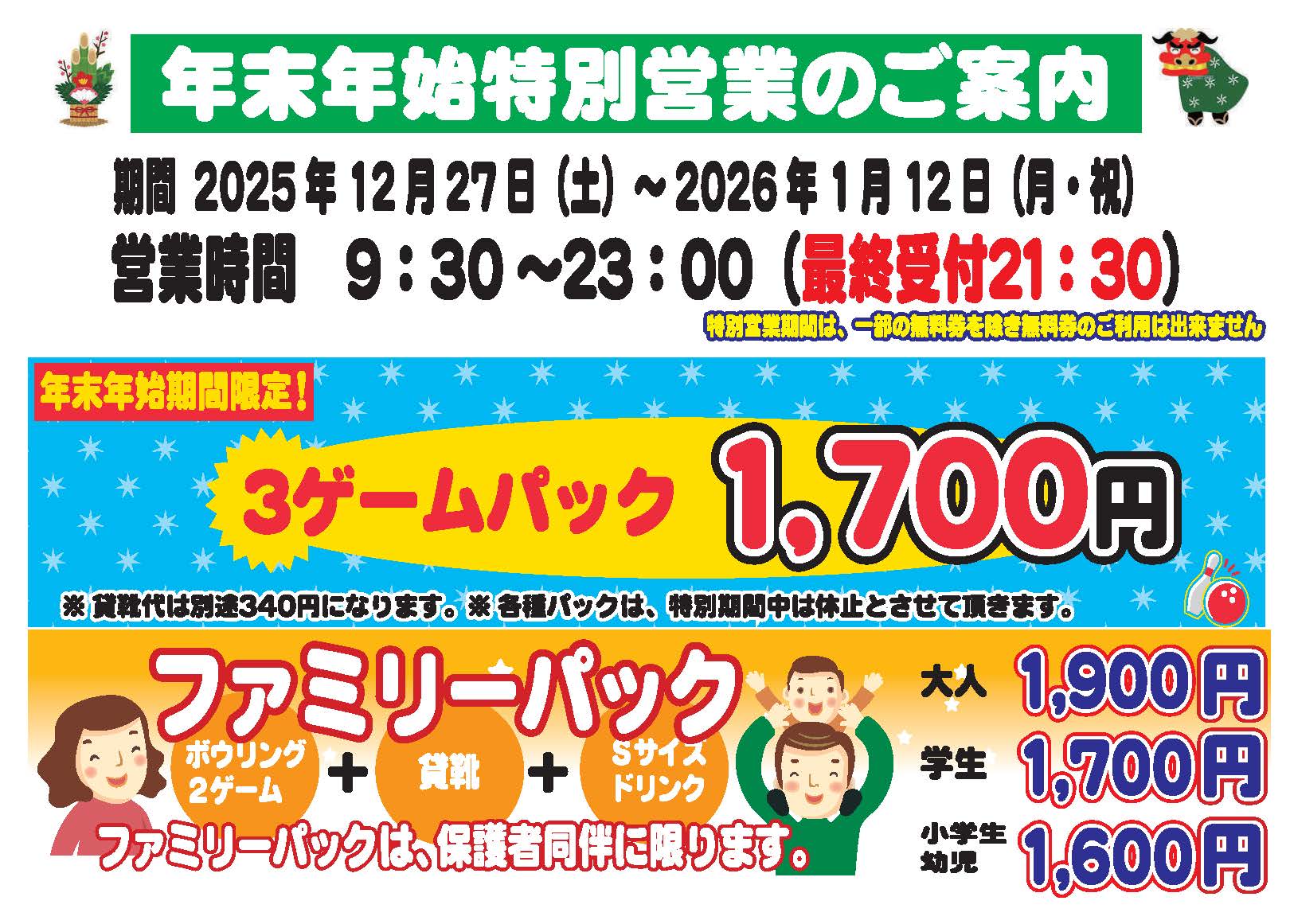 期 間 12月29日(金)〜1月8日(月) 営業時間 9:30〜23:00 (最終受付21:30) *期間中、各種無料券のご利用はできません。